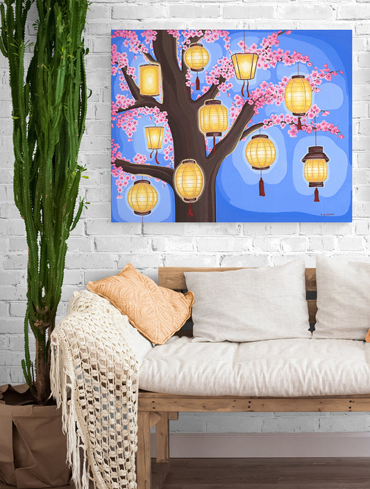 Bring a sense of profound peace and magic into your home with this vibrant celebration of the Sakura season. The composition is anchored by the strong, dark form of the trunk, which beautifully balances the rhythmic, geometric silhouettes of the glowing lanterns. A serene palette of sky and periwinkle blue provides a tranquil backdrop, creating a stunning contrast against the warm amber light and soft pink petals. Its clean lines and bold shapes offer a modern, illustrative feel.