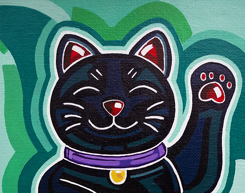 This glossy black cat sits proudly with a subtle smile and closed eyes, radiating quiet confidence and a hint of mystery. The vibrant green background is alive with abstract forms and lush, botanical tones, creating a sense of natural energy and growth. Dynamic yet balanced, this piece offers a modern interpretation of the Japanese Lucky Cat, designed to bring protection, grounding energy, and a playful sense of curiosity to your space.