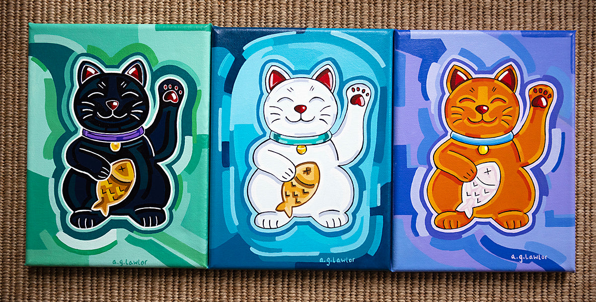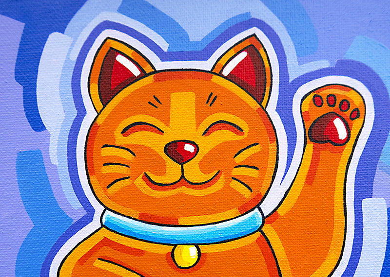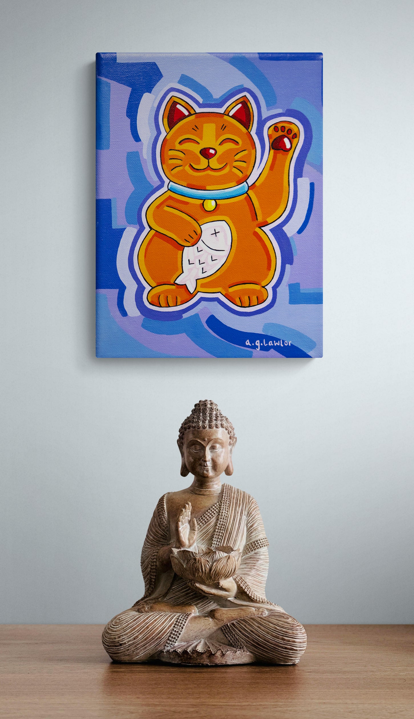 This painting is one of three in my series "3 Faces of Fortune", a quirky, colourful tribute to the Japanese Lucky Cat (Maneki-neko). Inspired by a small white ceramic lucky cat gifted to me from a family member’s travels in Japan. This trio of cheerful cats reflects my love of travel-inspired art and playful character design. Each painting in the series is painted to welcome good fortune, joy, and a little protective charm into your space—with bright hues, charming faces, and a wink of whimsy to greet you every day.