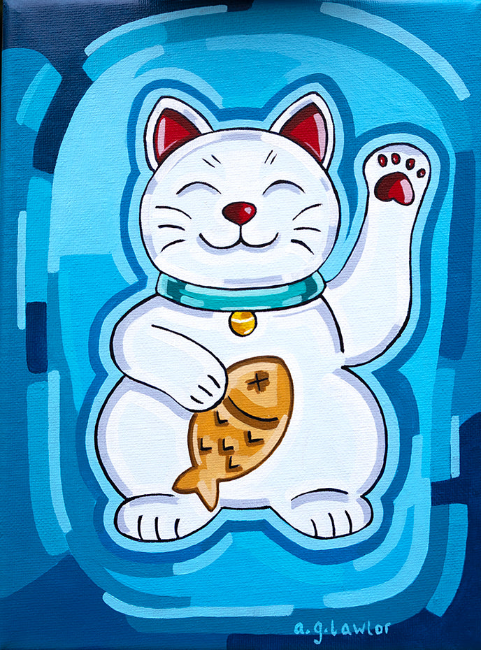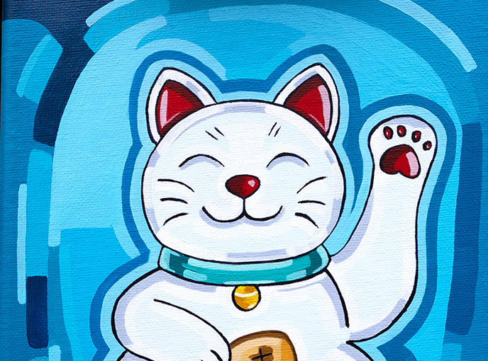 This painting is one of three in my series "3 Faces of Fortune", a quirky, colourful tribute to the Japanese Lucky Cat (Maneki-neko). Inspired by a small white ceramic lucky cat gifted to me from a family member’s travels in Japan. This trio of cheerful cats reflects my love of travel-inspired art and playful character design. Each painting in the series is painted to welcome good fortune, joy, and a little protective charm into your space—with bright hues, charming faces, and a wink of whimsy to greet you every day.